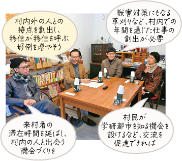 村の移住交流推進員として空き家の調査やイベント開催などに取り組む方、移住者として農業や地域活動などに取り組む方々と、移住促進のためのアイデアについて語り合いました。