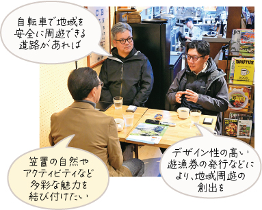 アウトドア愛好者と地域をつなぐカフェ代表と、木津川漁協で釣り人口増加に取り組む方と共に、地域資源の磨き上げと魅力発信について語り合いました。
