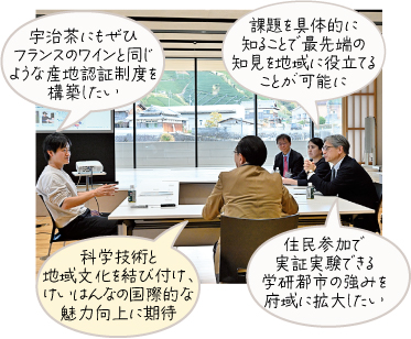 けいはんな学研都市で多様な社会課題解決に取り組むスタートアップを支援する研究機関の方々や、和束町内に移住しお茶にまつわる多角的な事業を展開する方と、学研都市との人流促進や交流について語り合いました。