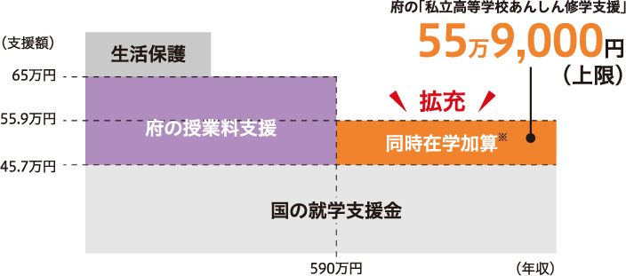 - 年収590万円以上で兄弟姉妹が同時に在学(高校・大学など)する世帯に対し、支援を拡充