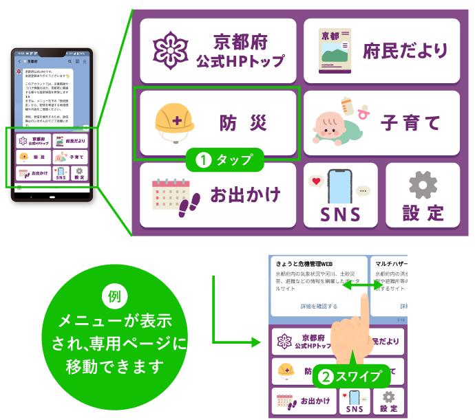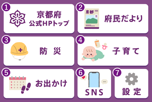 京都府公式HP、府民だより、防災、子育て情報などにいつでもアクセスできます。