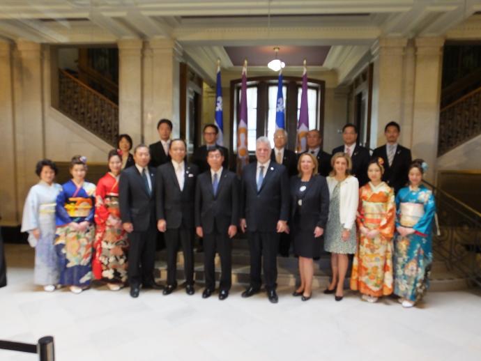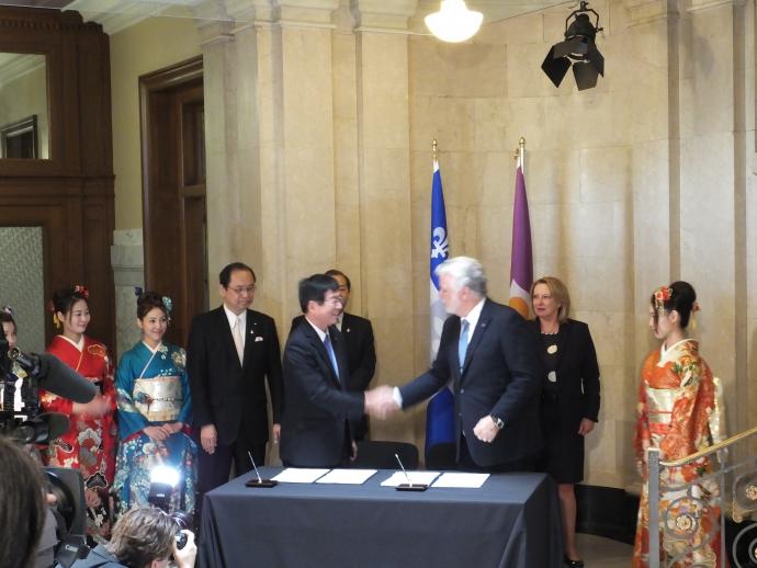 京都府では、カナダ・ケベック州とモデルフォレスト運動や大学・高校間における青少年交流等により交流を重ねてきましたが、この度、スマートシティや映像・コンテンツ分野など交流の幅を広げ、両地域の協力関係を拡充するため、同州に訪問団を派遣し、友好提携に係る協定を締結しました。