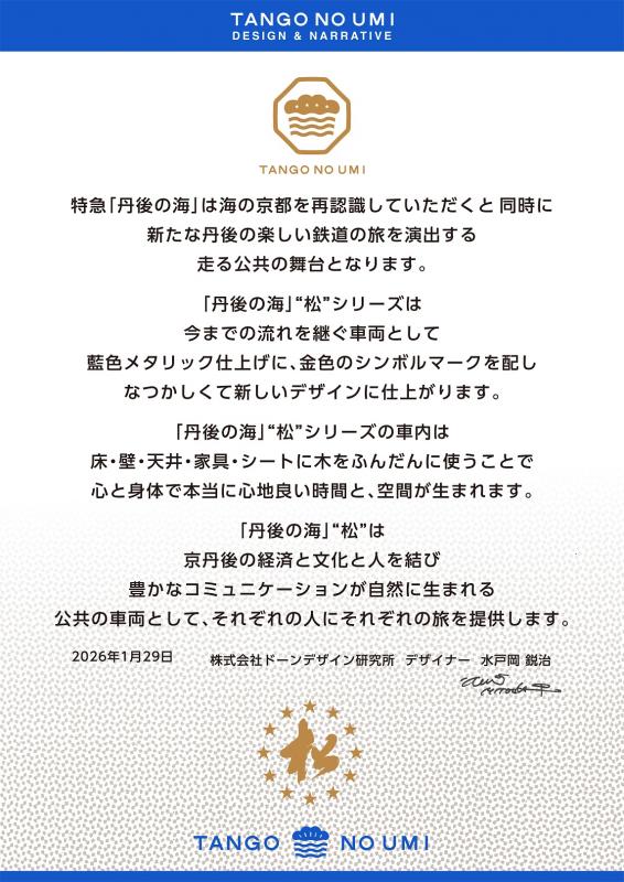 デザイン・設計は、「丹後くろまつ号」など丹鉄の観光車両をはじめ、「ななつ星」などの多くの鉄道車両のデザインを手掛けてきた水戸岡鋭治氏(ドーンデザイン研究所)に依頼し、この度、車両のデザインコンセプトが決まったことを受け、デザインの発表(パース図の公表)セレモニーを1月29日に京都府庁で開催しました。