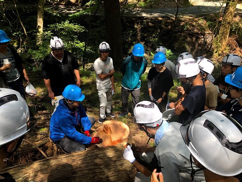 演習林では講義を開催していただき、伐採見学と製材体験をさせていただきました。