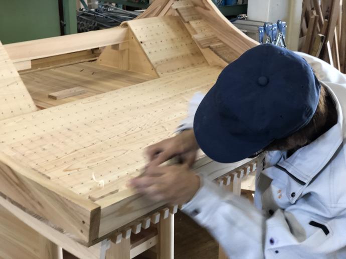訓練生が加工し、鉋仕上げをした部材が次々に組みあがっていきます。1ミリの隙間もあけることなく、ぴったりとおさめるには、精度の高い加工技術が必要になります。下の画像では「反り台かんな」を使用して、破風と呼ばれる部材の上端を削って、反りを形成しています。