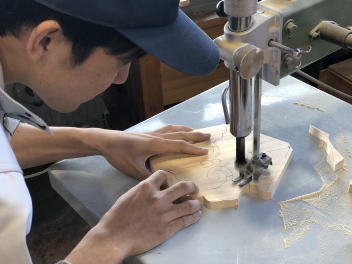 また、社寺建築において彫刻は欠かせない装飾要素であり、これらも訓練生の手によって加工されます。木の繊維によって刃を入れる方向を考えて彫刻しなければなりません。ほんの小さな彫刻であっても、見極めが大切です。