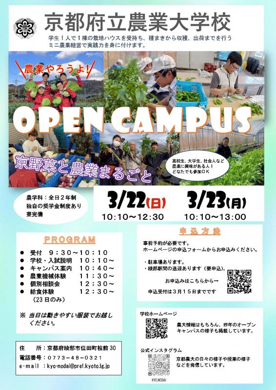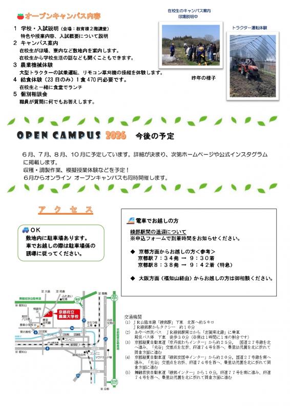 入試情報やキャンパス案内、農業機械体験などなど、京都府立農業大学校の雰囲気を肌で感じてもらえる内容となってますので、ぜひ、ご参加ください。