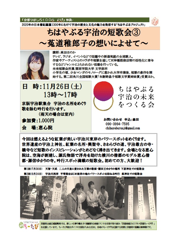 今回は、高田ほのかさんを講師に迎えて、ちはやぶる宇治の短歌会②を開催いたします。