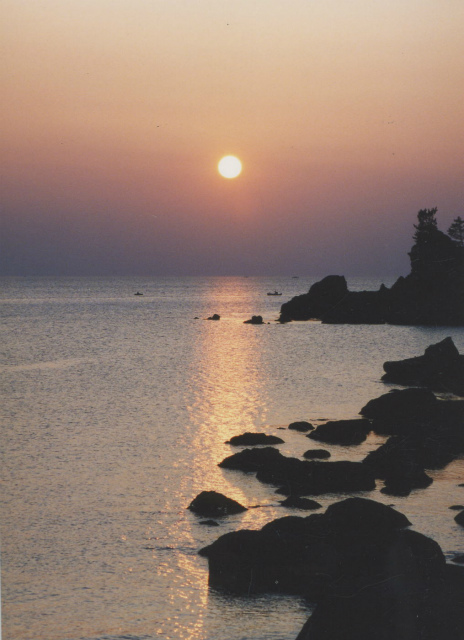 日本の夕日百選に選ばれた海岸。茜色の夕日が水平線に沈んでいく風情は圧巻。