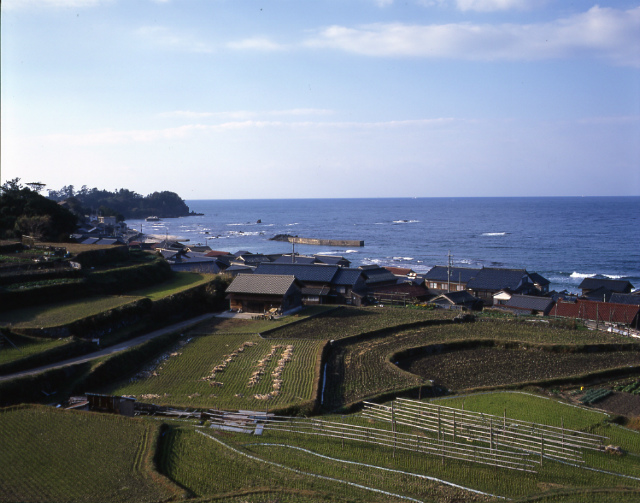青い日本海が見渡せ、海と里山と集落が調和した景観が美しい。「日本の棚田百選」。棚田枚数は400枚