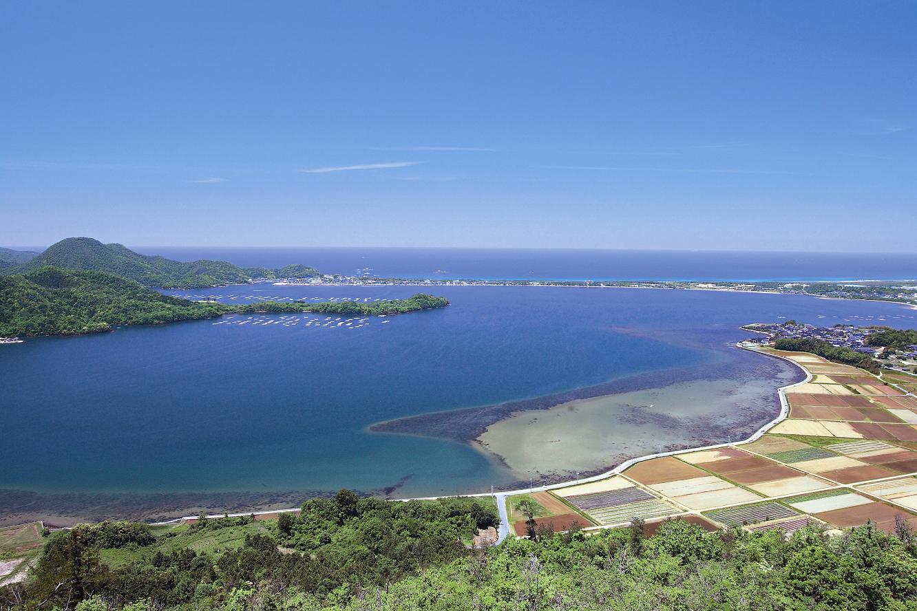 小天橋砂州によって日本海と隔てられている面積約7.1平方キロメートルの汽水性の潟湖。カキの養殖が盛んでカキ筏が並ぶ様子は冬の風物詩になっている。美しい湾の四季折々の眺めは、かぶと山公園展望台や東山公園から堪能できる。