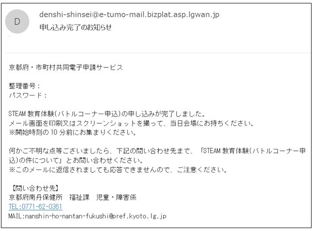 が完了すると、申込完了メールが届きます。※届かない場合は下記の問い合わせ先まで、「STEAM教育体験(バトルコーナー申込)の件について」とお問い合わせください。
