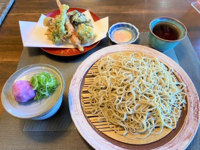 自家栽培・自家製粉・十割手打ちそばが自慢のそば店。おすすめメニューは天ざるで、地元産の野菜天ぷらも楽しめます。麺だけでなく、蕎麦プリンもいただけます。