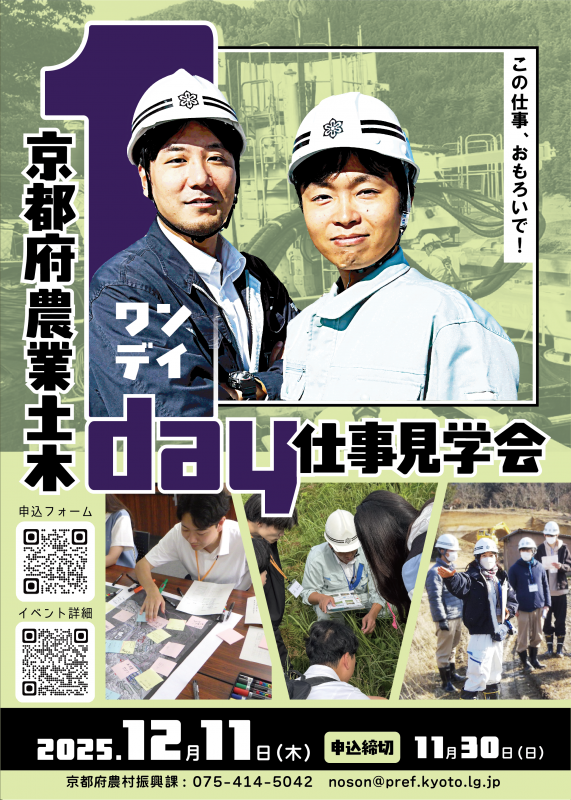 工事現場の見学やグループワークなどを通して、京都府の農業土木職が行っている仕事を、職員らが説明する「京都府農業土木1day仕事見学会」を開催します。