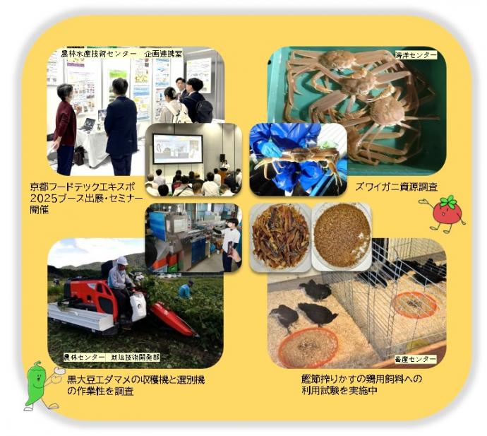 当技術センターは、4つの部門(農林(森林技術センター・丹後農業研究所・茶業研究所)・生物資源研究・畜産・海洋)センター及び総務室・企画連携室で構成されています。