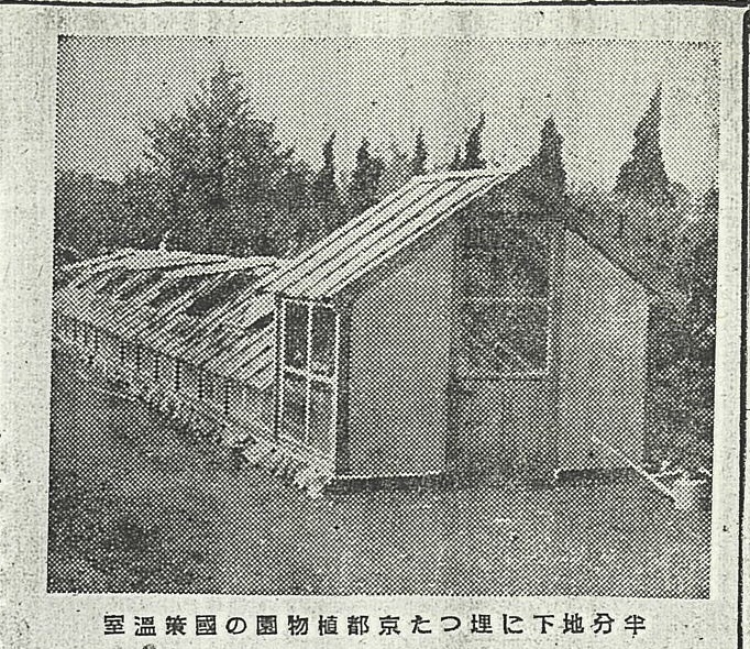 栽培温室は燃料を抑えるために建物を半地下の構造にして夜は藁などで保温する工夫をし、加温のためのスチームや鋼材が必要ない「国策温室」を建築したことが当時の新聞に掲載されています(写真左)。