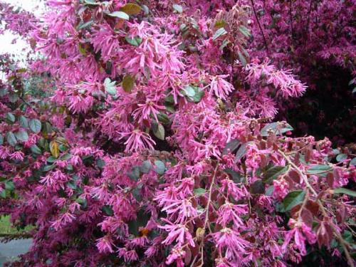 中国原産。トキワマンサクの赤花種で、葉も赤葉(銅葉)です。次々分枝するため、剪定してもすぐに広がった樹形となります。宿根草・有用植物園東入口に植栽しています。