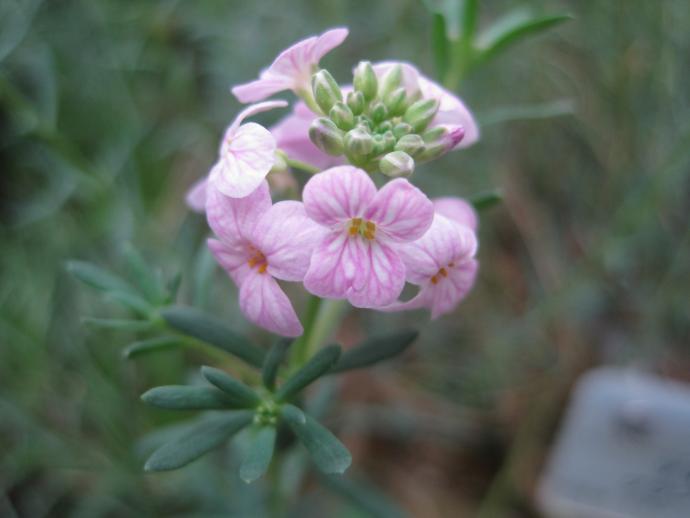 の桃色の花をつける。高山植物室で5月中旬まで見頃。