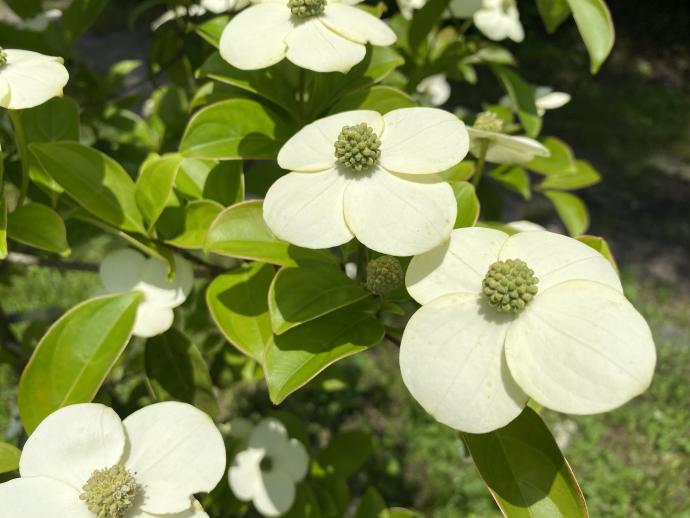 中国南部からインドシナ半島が原産の常緑性ヤマボウシ。アメリカヤマボウシ(ハナミズキ)、ヤマボウシに遅れて開花する。