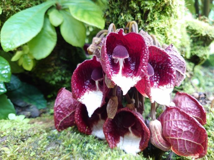 中米原産。萼の内側にあるキノコによく似た突起部は、キノコに産卵する性質をもつキノコバエを呼び受粉させるため進化したといわれている。冷房室にて見頃は9月上旬まで。