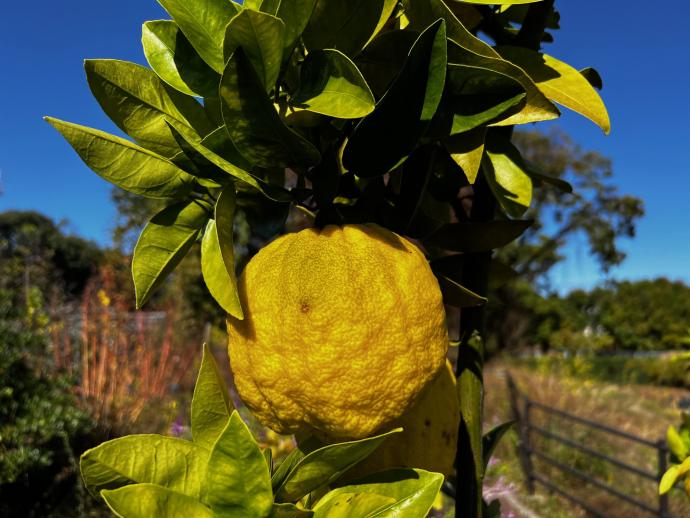 中国原産の常緑樹。日本に入ってきた時代は古く関東以西の各地で栽培される。名にユズとあるがブンタンに近くユズのような強い香りはない。中はぶあつい綿で占めれており食用よりも観賞に供される。四季 彩の丘にて見頃は12月頃まで。