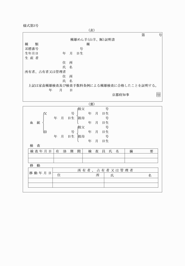 第6条 検査に合格した種雄には耳標を着け、その所有者等には別記様式第3号による種雄めん羊(山羊、豚)証明書(以下「証明書」という。)を交付する。