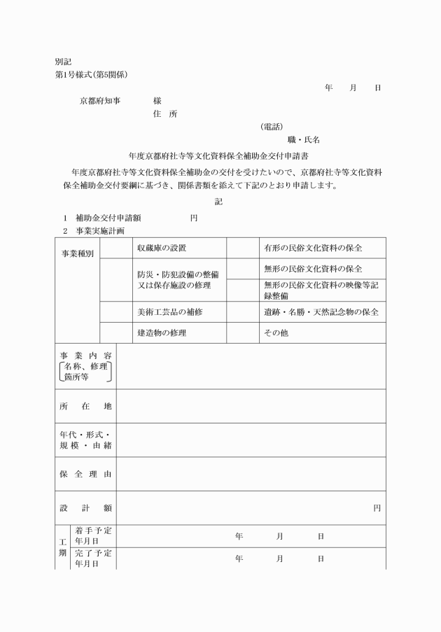 第5 この告示に基づき補助金の交付を申請しようとする者は、京都府社寺等文化資料保全補助金交付申請書(別記第1号様式)に次に掲げる書類等を添えて、2部を別に定める日までに知事に提出しなければならない。