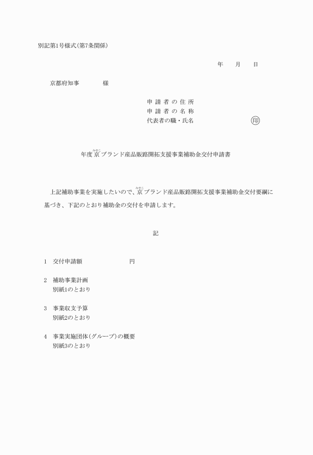第1条 知事は、京都産業の生み出す優れた地域特産品の京都府外等における販路開拓を通じて京都産業の活性化を図るため、京都府内の中小企業者が共同で実施する京ブランド産品販路開拓事業に要する経費に対して、補助金等の交付に関する規則(昭和35年京都府規則第23号。以下「規則」という。)及びこの要綱の定めるところにより、予算の範囲内において補助金を交付する。