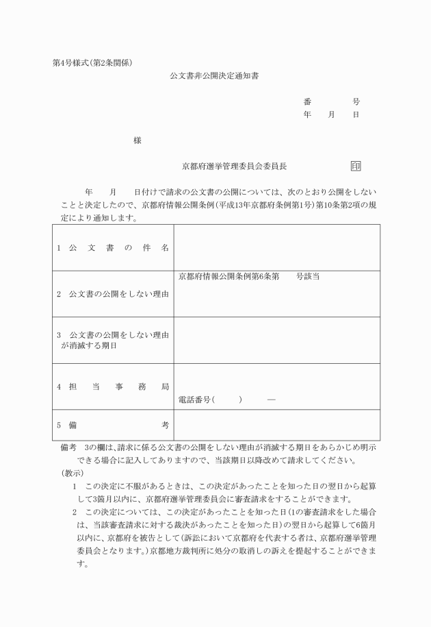 2 京都府選挙管理委員会は、閲覧による公文書の公開を受け、又は受けようとする者が、当該公文書を汚損し、若しくは破損したとき又はこれらのおそれがあると認められるときは、当該公文書の閲覧を停止させ、又は禁止することができる。