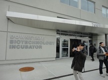 ニューヨークのバイオベンチャー支援。ニューヨーク州立大学内にある「Biotech Initiative」(左)で、大学と連携しながらアーリーステージ支援を行い、ブルックリンの倉庫を改修した「BioBAT」(中、右)で成長支援(生産設備もあり、料金は1企業当たりざっと年1億円)。
