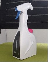 噴射口付近に内蔵された小型の電極により、ノズルを登ってきた水を電気分解しオゾン水を生成します。据え置き型のオゾン水生成器のように、水槽に溜まった大量の水を電気分解するのではなく、1回あたりに噴射される1cc程度の水量を都度電気分解するため、瞬時にオゾン水を生成して噴射することができます。