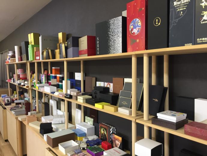 戸田会長)弊社は昭和10年創業の貼箱専業のメーカーです。売上の概ね3分の2が貼箱、3分の1が桐箱で、仕事は顧客からの紹介や自社ホームページ経由のものが大半です。貼箱とは、板紙製の紙器(紙箱)の表面にデザインされた薄紙を貼って美しく加工した化粧箱のことです。高級な贈答品の容器として用いられ、宝石、時計、文房具、化粧品、酒類、菓子類など様々な分野で容器として用いられています。元々は伝統産業の手工芸で1つ1つ手作業にて製作されていましたが、現在では機械技術の進歩により量産が可能になりました。人件費の高くなっている中国では製造工程の機械化が進み、国内以上に生産性向上が図られています。桐箱は年100万個を扱い、国内でもトップレベルの取扱量を誇っています。売上は約5億円、従業員は20名でそのうち9人が中国からの技能実習生です。