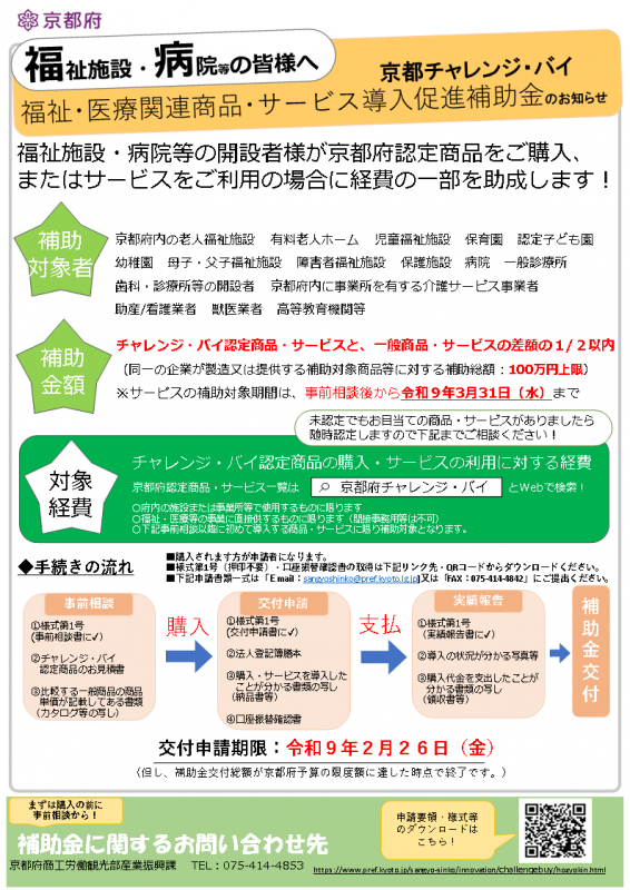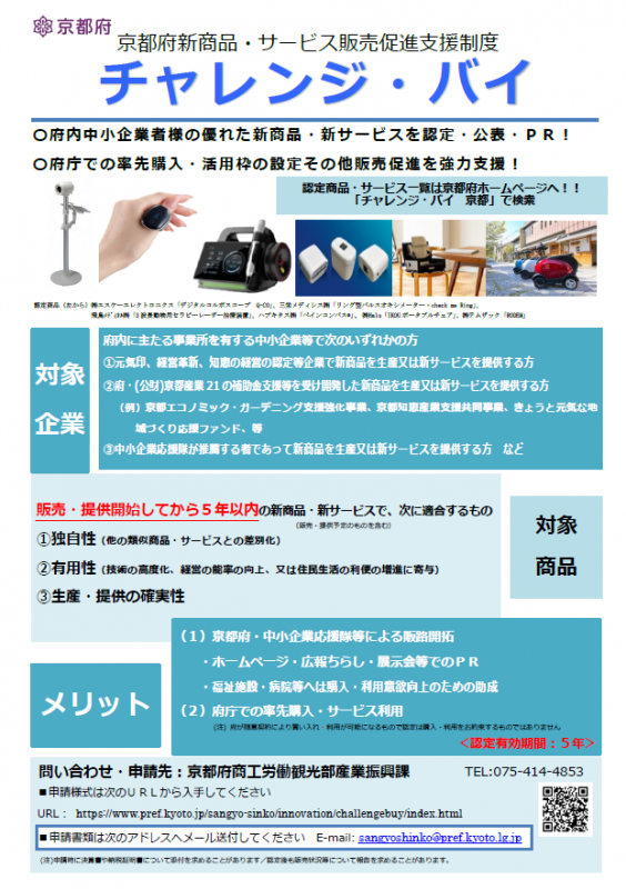 府内中小企業の新商品・サービスを、京都府が認定し、率先購入する制度です。あわせて、病院・介護施設・研究機関等が購入する場合の補助も行っています。