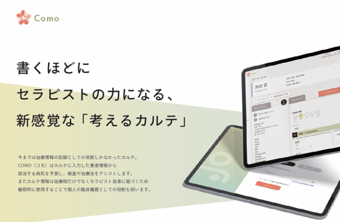 鍼灸整骨院の治療をサポートするAI機能搭載の電子カルテです。患者さまが入力した問診票を元に、2,000疾患の中から可能性がある疾患をAIが予測し、それを確定するために必要な検査や追加の問診項目を提供するサービスです。