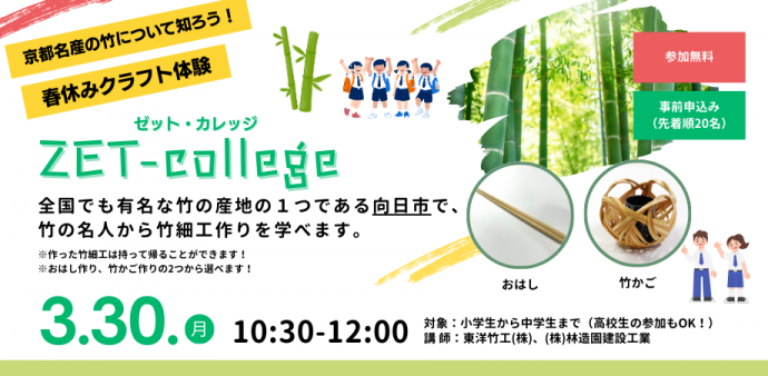 主な脱炭素の課題を総合的な知見及び柔軟な発想で解決できる人材育成に向けて開催してきた「ZET-college(ゼット・カレッジ)」において、若年層向けの無料竹細工ワークショップを開催します。