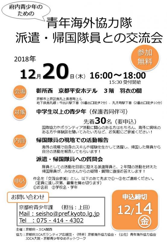 青年海外協力隊として海外現場で活躍し、帰国した隊員や、海外での活動を目前に控えた派遣隊員と青少年の皆さんがふれあえる交流会を開催します。