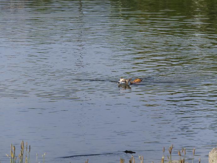 昨年の台風18号の影響で高野川の中州、寄州も小さくなり、そこに生える草も少なくなりました。昨年の初夏には鹿の親子を3組見ましたが、大人の鹿は雌ばかりでした。今年は一頭の雄鹿も姿を現しました。
