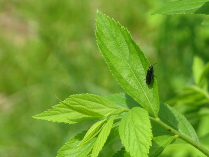 街中でも新緑を追いかけます。街中の鴨川では、虫たちが短い命を輝かせています。若葉に留まる“真っ黒な羽虫”も葉を囓っているのでしょうか?黒く輝いています。