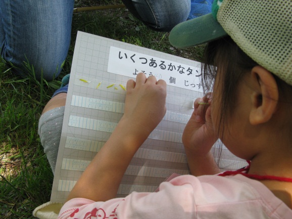 指導員さんの「これ何かわかるかな?」の問いかけに一同「わかりません」としか答えられませんでした。すると、「これは“テントウムシ”の卵ですよ。」と教えて頂きました。