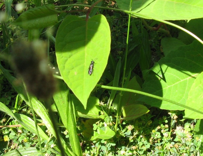 今度は、青々とした葉の上に留まっている黒い羽虫を指差して「この虫は何の仲間か判るかな?」と指導員さん。「う~ん」と思案していると、「お尻のところを見てごらん。ヒントがあるよ。」と促します。
