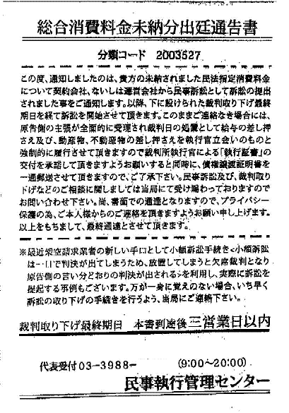 | ミ | 民事事務局訴訟通達課(GIF:37KB) | 消費契約取引料金未納 | 東京都中央区新富4-5-33 | 11月16日掲載 |