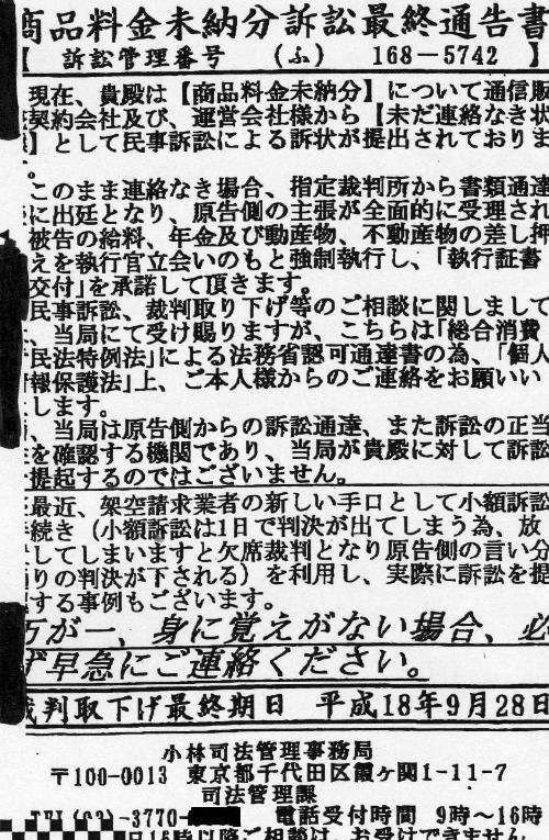 | 二 | 日本訴訟管理事務局(GIF:28KB) | 通信販売商品代金 | 6月26日掲載 個人宅のため所在地の掲示はしない |