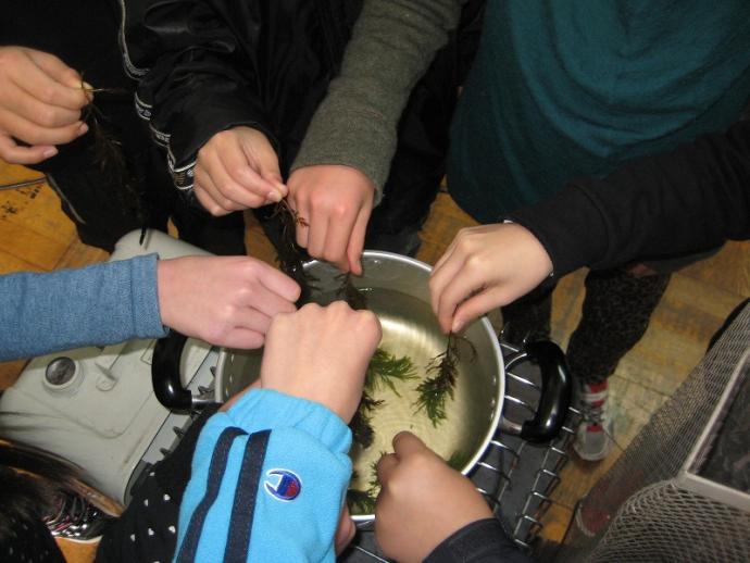 1月21日に、宮津市立養老小学校の5年生を対象に、地元の海に生える海藻「アカモク」を取り上げて授業を行いました。内容はアカモクの特徴である、成長の早いこと(1年で7メートルにまで成長する)、藻場を形成し、沿岸生態系の中で重要な役割を果たし、また、海の富栄養化を防止すること。食感の特徴である粘り(アルギン酸など)についてや、繊維質が多く、健康に良いことについて、「ぐんぐん、もじゃもじゃ、ねばねば」をキーワードに解説しました。また、アカモクの加工方法や料理の紹介を行いました。その他にも、実際にアカモクを生徒一人一人が熱湯に浸け、色が瞬間的に変わる様子を観察しました。