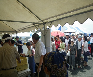 大変暑い中での開催となりましたが、もてなしコーナーで用意した”大漁鍋”あご(とびうお)のつみれ汁やワカメのしゃぶしゃぶは約400名の方が召し上がられ、「とびうおのつみれは初めてだ」、「汗をかいた後なので本当においしい」といった声が聞かれました。
