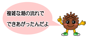 砂嘴の部分についても、昔は、川から流された砂や海からの砂が海岸に流れ着いて大丈夫だったのが、いまは、川や海を守る工事が進んで、砂が流れなくなったために、昔のように砂が付かず、逆に波により減ってしまいます。