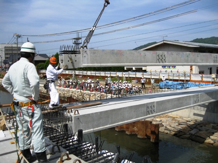 (写真左)架け替え作業時の様子。左が旧橋梁、右が新しい橋梁