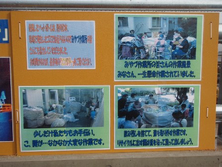「みやづ作業所では、回収されたペットボトルをリサイクルできる状態にするため、飲み残しを捨て、蓋を取り外す作業をされています。このペットボトルを一時お借りしています」 とのことです。