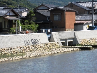 落書きされた堤防(中橋から京口橋間の右岸側)