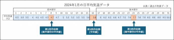 表1は、2024年の1月の京都の日平均気温データをまとめた表です。