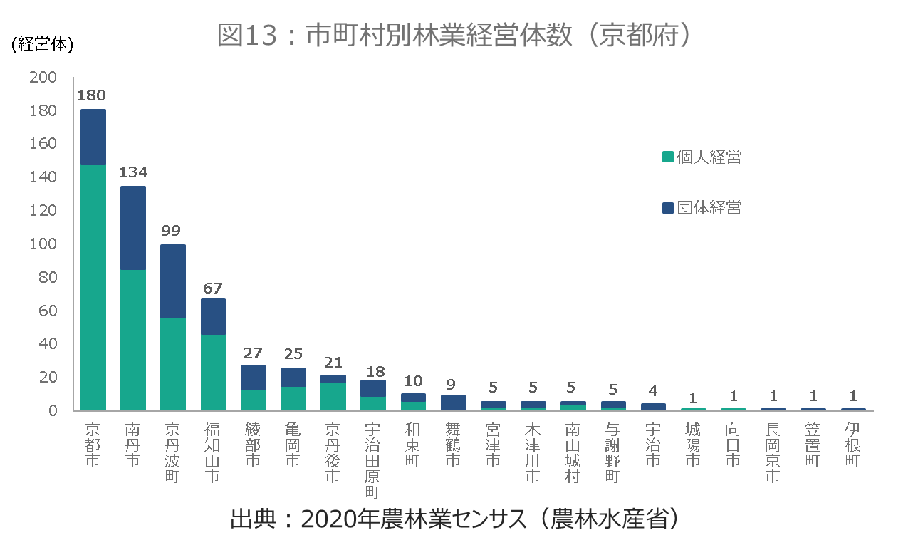 林業経営体は、京都市、南丹市、京丹波町の順に多くなっています。